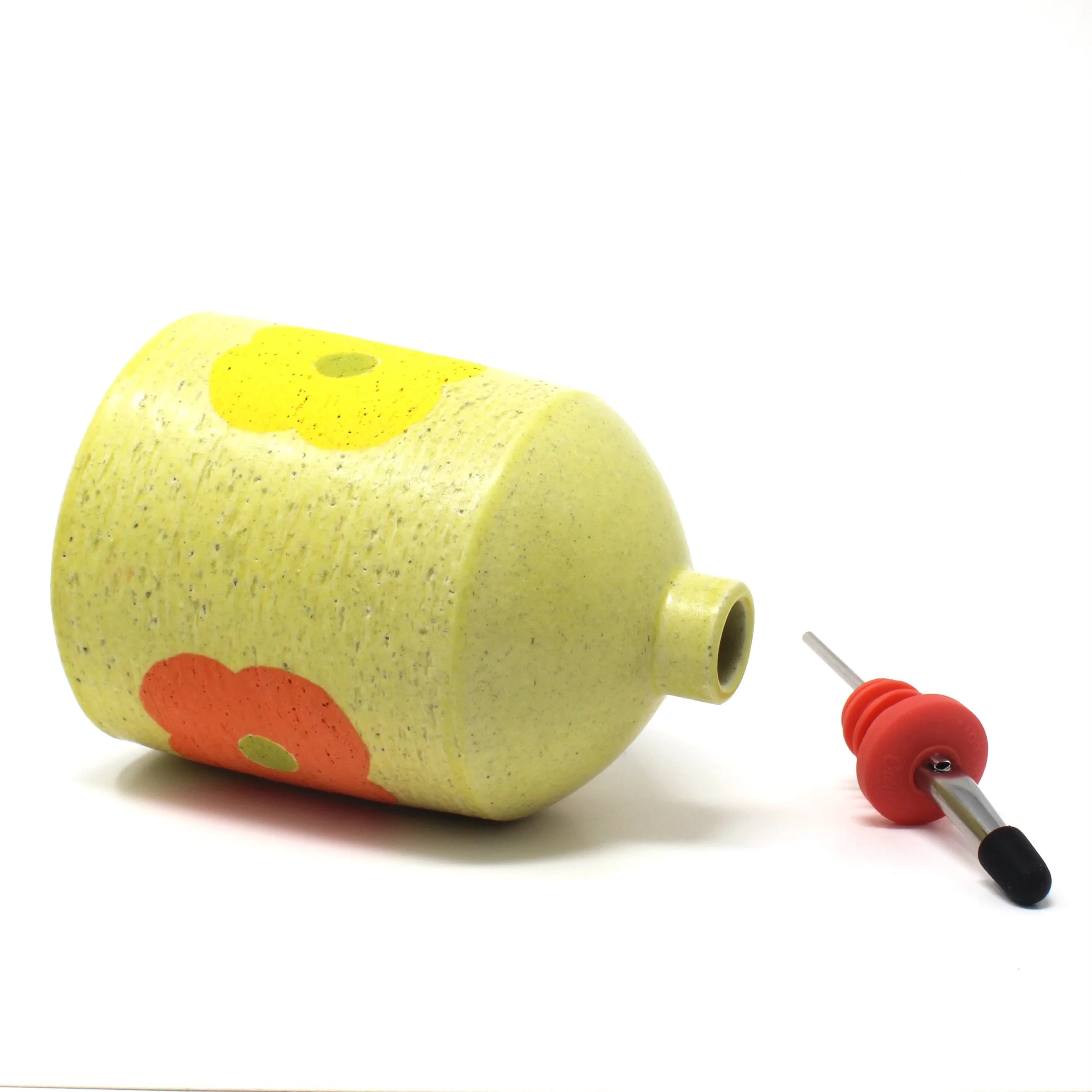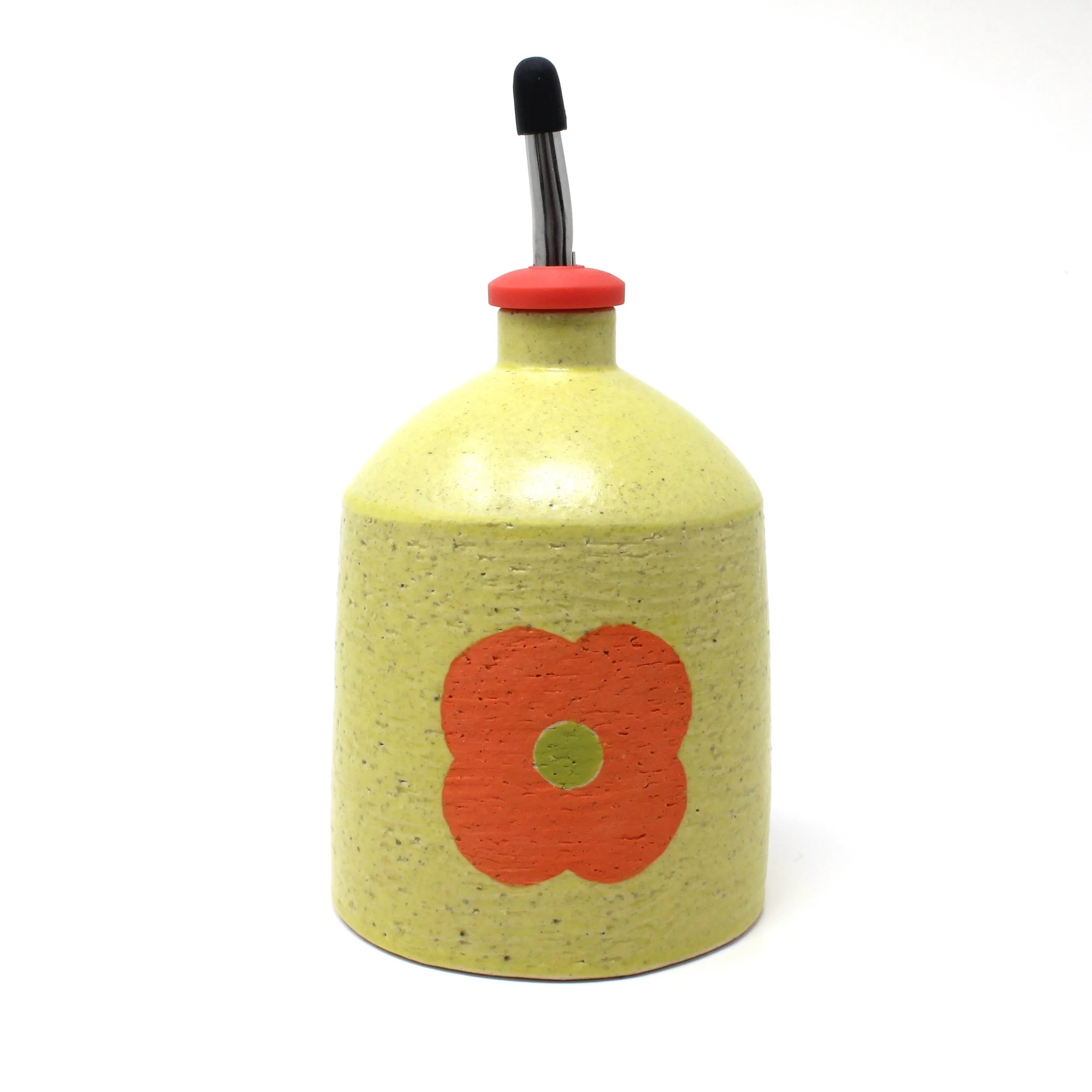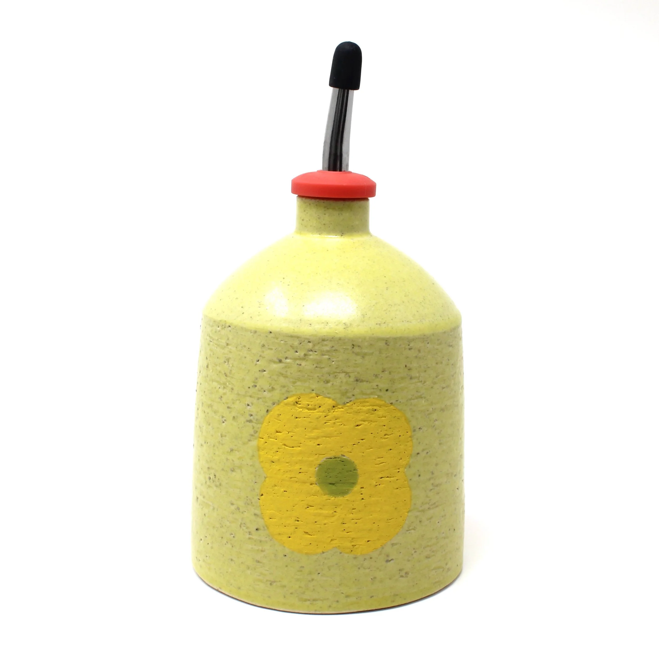 Thrown bottle with a hand-painted flower on three sides, finished with a yellow satin glaze. Comes with a pink oil pourer.